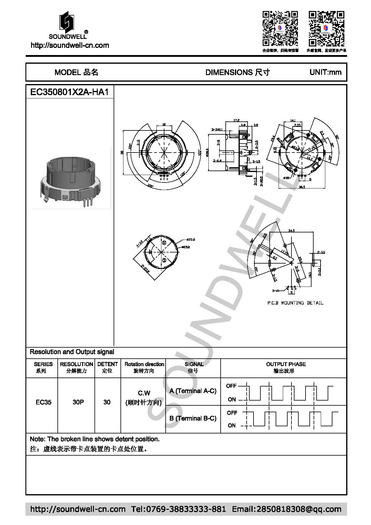| Main Specifications: | Rated power: DC 5V; Number of detent: 30; Pulses: 30; Rotational torque: 80-280 gf.cm. Working temperature: -40℃~85℃; Rotational life: 30,000 cycles Min; |