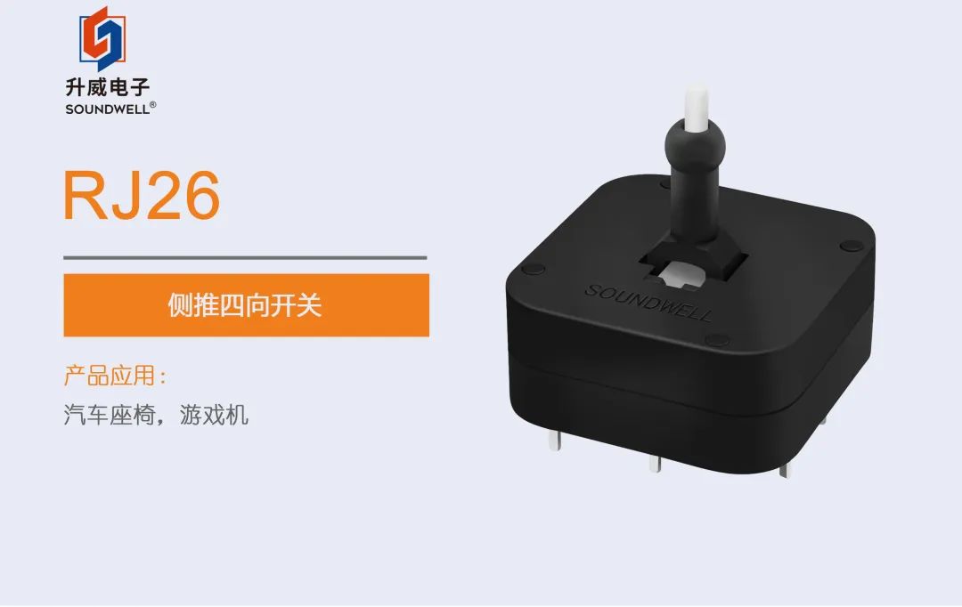 除此以外,應用在汽車座椅調節的開關我們還有RJ26,它與RJ20最大的區別是一款側推四向開關(中間無按壓功能),可進行四個方向的調節。