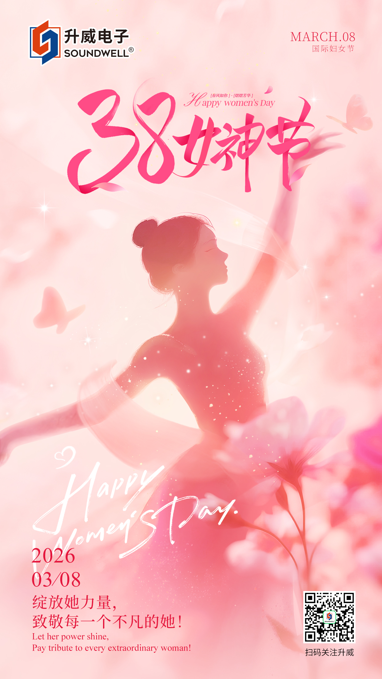 巾幗逢盛世,奮進正當時。再次祝愿升威電子全體女性員工:三八女神節快樂!愿你眉目有光,心底有愛,不負韶華,不負自己;愿你往后余生,平安喜樂,光芒萬丈,與升威同心同行,共赴更輝煌的未來!