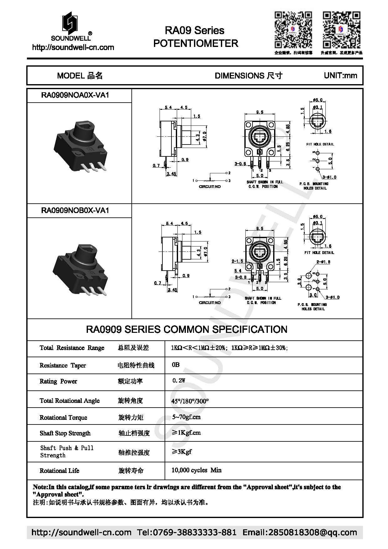 RA09電位器開關產品規格參數